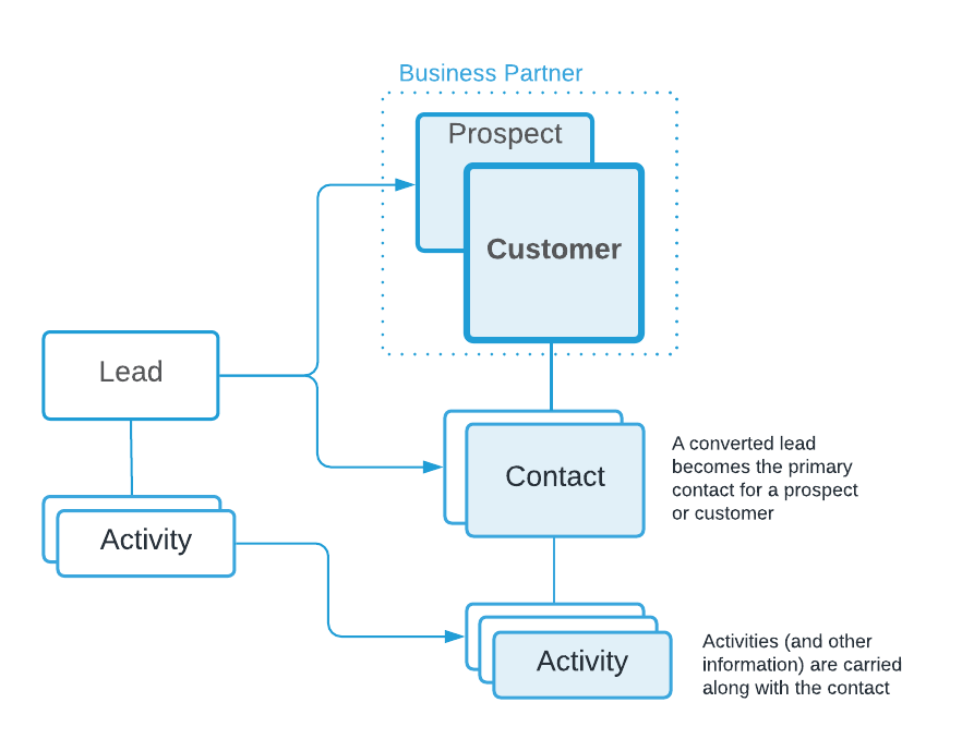 The sales process uses three primary entities: Leads, Prospects and Customers. A lead is an individual contact, such as a referral or a name obtained from an advertising campaign. Leads can have Activities associated with them. Activities are records where you would keep track of interactions with a person, such as emails or phone calls.