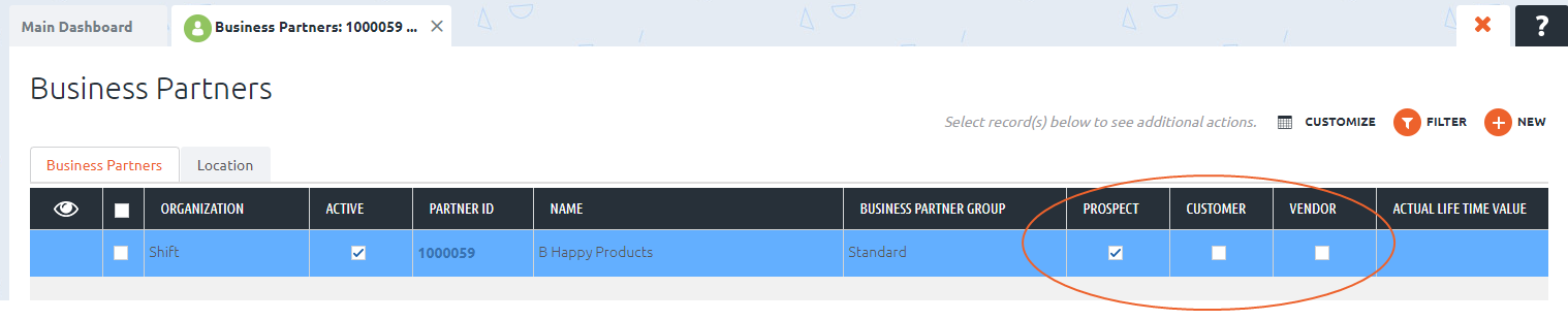 In this case, only our sample "B Happy Products" is returned. Note that the box for PROSPECT is currently checked. To make the change, simply select the record, check the CUSTOMER box and un-check the PROSPECT box.