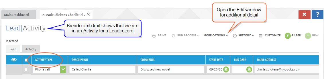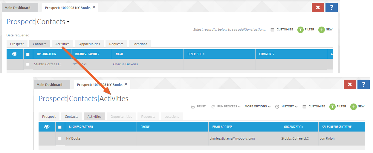 By selecting the Contacts tab, we have access to the Activity records for Contact Charlie Dickens. By clicking on the Activities tab, we can see that the Activity that was entered on the Lead record has remained. This is the case with all conversions: Records that you enter at one stage will be retained.