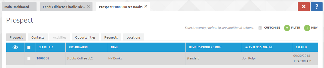 After clicking the check mark, the lead is no longer visible in the Leads grid view, and instead is now visible in CRM > Prospects.