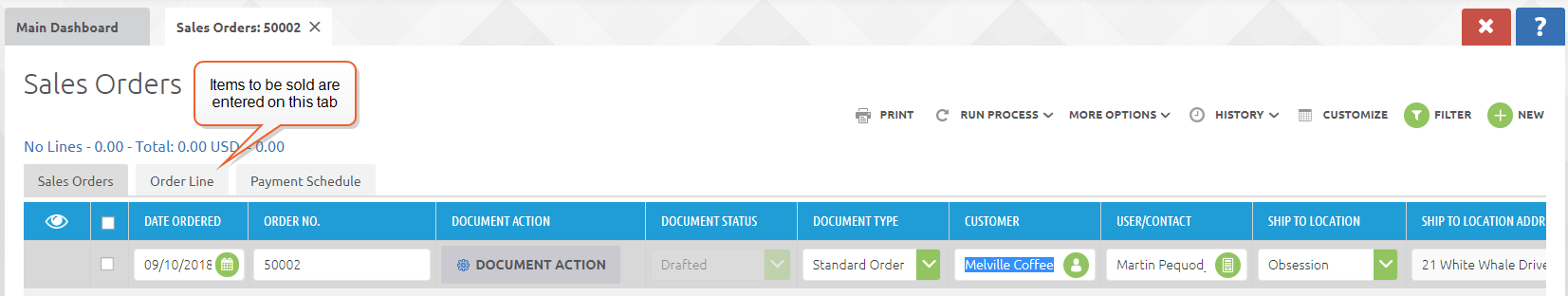 Once the header information has been entered, you will then enter the lines for the items that will be included in the sale. This is done using the Order Line tab. Lines are entered as usual using the + New button. To add multiple lines, use the green "Save and Add New" button on the lower right.